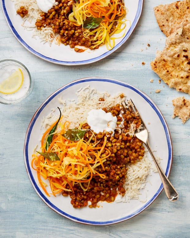Traditionally, this is made without onions or garlic, making it a simpler and gentler dal, but it does need a perky sidekick, hence the sambharo, a sweet-and-sour relish, alongside. At home, Mum would serve this with wholemeal chapatis, but I eat it with steamed jasmine rice, which I make once I’ve set the dal on to simmer. This might look like a lot of ingredients, but they all go into the pan in quick succession and many from the dal overlap with those in the sambharo.