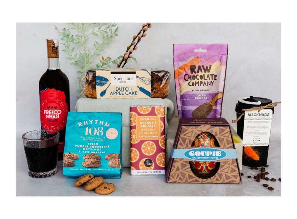 Go all out this Easter with a hamper instead of just a bunch of eggs for that special someone. Nestled in a recyclable box with shredded paper are a Goupie salted sticky toffee Easter egg, Choc Affair orange and rhubarb oat milk chocolate bar, Specialite Vegan Dutch apple cake, a bag of Rhythm 108 double chocolate hazelnut biscuits, The Raw Chocolate Co organic cacao powder and even a bottle of organic wine and a sustainable rice husk travel cup.