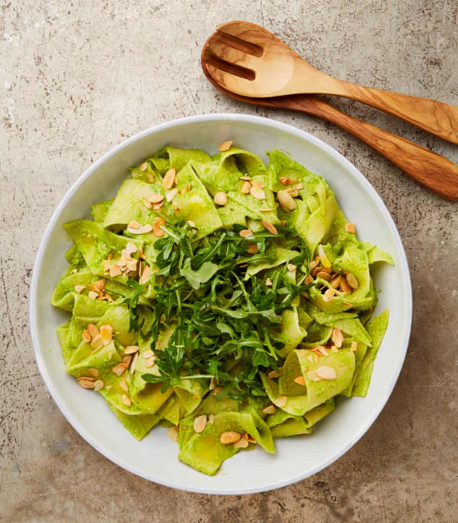 We need to talk about lasagne sheets. I always have a box in the cupboard, even though I rarely commit the time and effort to making a lasagne (a twice-yearly event at most). Unlike with most other pasta, where the shape dictates what you do with it, lasagne are the most flexible of all in that you can break them up as you wish. Here, I’ve used them to mimic fazzoletti, or handkerchief pasta, which are usually served with pesto. Here, I’ve used broad beans and rocket as the base for a pesto of sorts and cut them with toasted almonds, nutritional yeast and lemon.